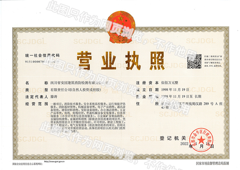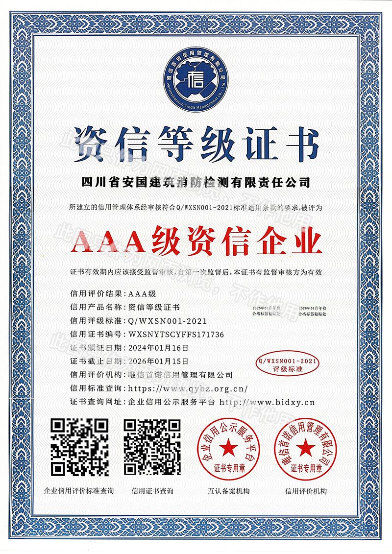四川省安國建筑消防檢測有限責(zé)任公司,成立于1998年,經(jīng)四川省公安消防總隊(duì)批準(zhǔn),工商部門注冊的獨(dú)立法人單位。